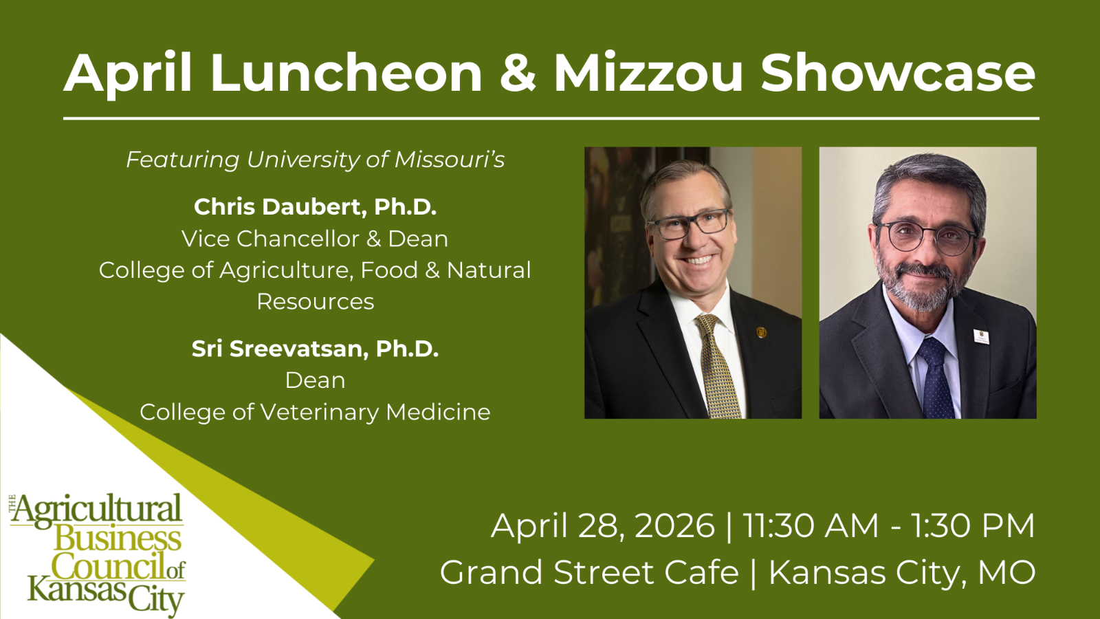 The Agricultural Business Council of Kansas City and University of Missouri College of Agriculture, Food & Natural Resources invite you to join us on Tuesday, April 28, for a luncheon meeting highlighting the University of Missouri and its impact on the state, region, nation and world.
